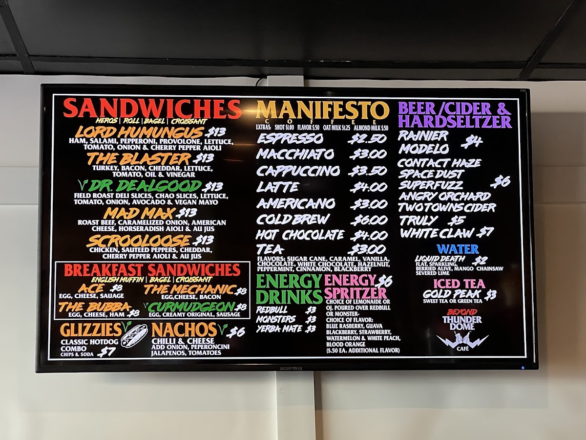 Accompany your meal with a delightful cup of Manifesto Coffee, ranging from $3.50 for an Americano to $5.00 for a refreshing Iced Latte. Guests rave about the friendly atmosphere, vintage gaming options, and live music, making it more than just a dining spot. Beyond ThunderDome is where delicious food meets a sense of community!
